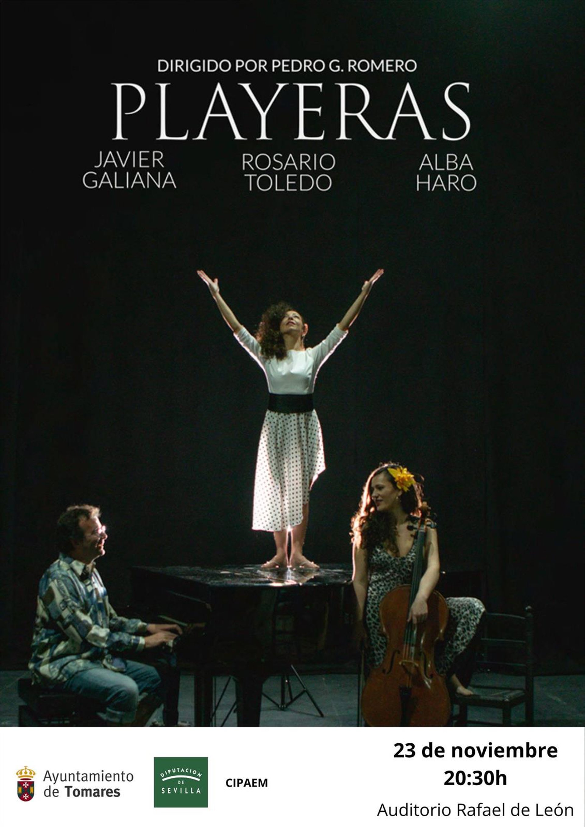 Tomares trae este jueves 24 al Auditorio municipal Rafael de León de Tomares (Sevilla), una "original propuesta escénica": 'Playeras'. Con la forma de un trío de jazz o de un cuarteto de flamenco, Rosario Toledo (bailaora), Alba Haro (violonchelo) y Javier Galiana (piano) presentarán esta función. Se trata de "otra forma de entender el fraseo, la profundidad de los ritmos y el vaivén del mar".
