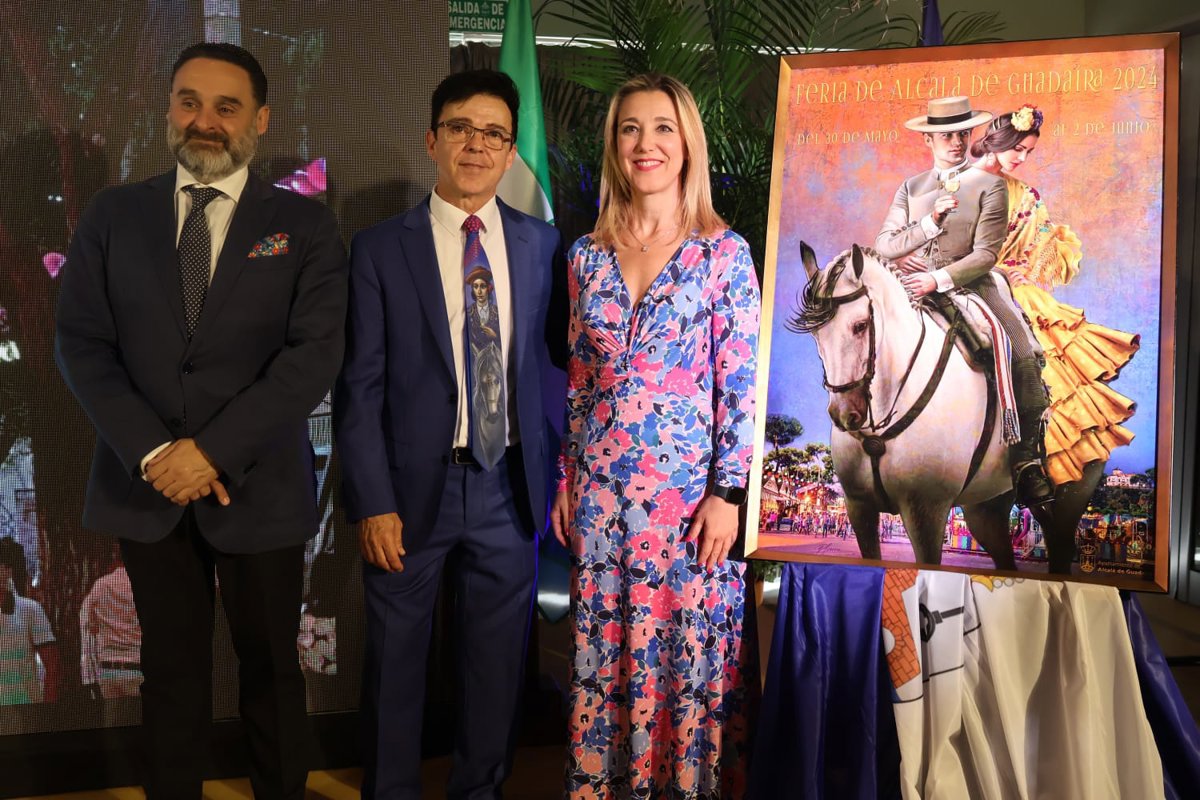 Una pareja a caballo sobre el real de San Juan, rodeados de pinares y envueltos por las luces y los brillos dorados de la feria y el albero alcalareño. El Ayuntamiento de Alcalá de Guadaíra (Sevilla) ha presentado este viernes el cartel de la Feria de Alcalá 2024, un pintura del afamado artista local Manuel Domínguez Guerra, "una obra de arte que queda para la historia local y que ha captado perfectamente la esencia y singularidad de esta fiesta", que se celebrará del 30 de mayo al 2 de junio.