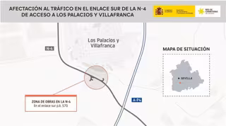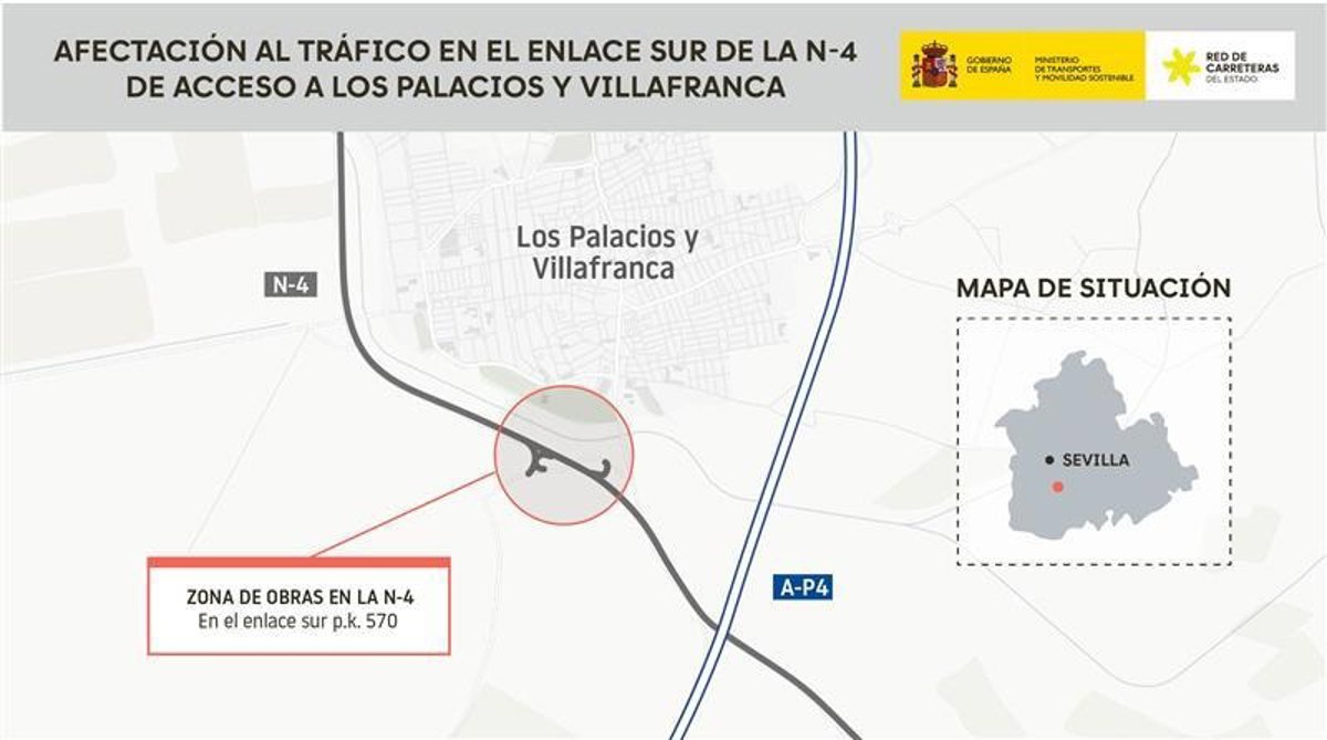 El Ministerio de Transportes y Movilidad Sostenible ha autorizado las obras de mejora de conexiones viarias al enlace sur de acceso a Los Palacios y Villafranca (Sevilla), en el marco del Proyecto de Urbanización del Plan Parcial del sector SUS-17 del municipio. Por ello, y "para garantizar la seguridad de los trabajadores y usuarios", a partir del próximo lunes 6 de octubre desde las 8,00 horas, se realizará el corte total de un tramo del ramal del enlace del km 570 de la N- 4.