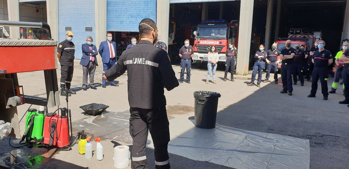 La Unidad Militar de Emergencias (UME) imparte formación en materia de desinfección a los bomberos de Sevilla para ampliar sus capacidades de actuación ante el Covid-19 y comparte experiencias sobre labores de esa naturaleza realizadas en infraestructuras estratégicas de la ciudad.