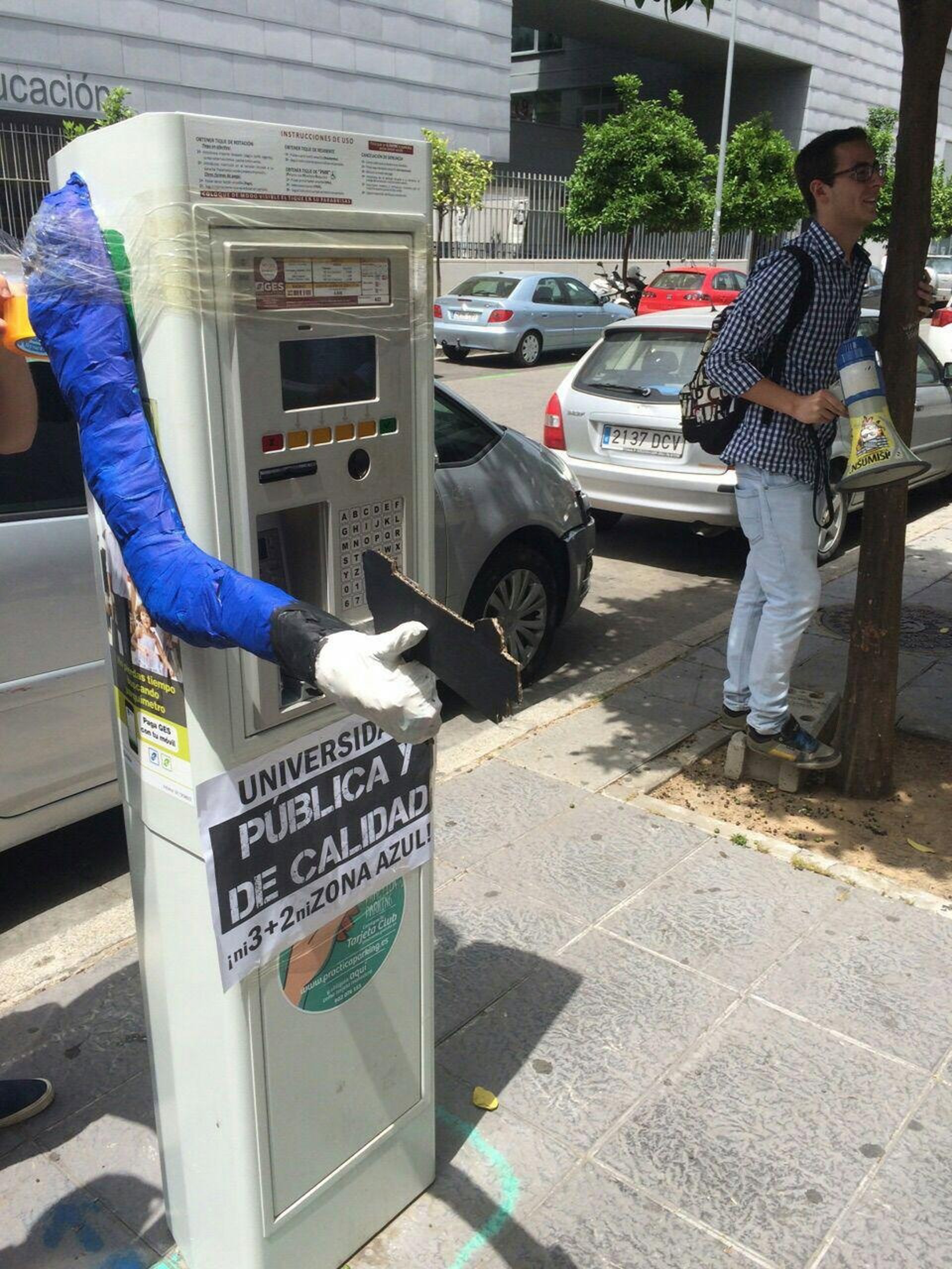En cuanto al acto de este martes, para simbolizar el "atraco a mano armada" que supone la zona azul como privatización de los espacios públicos, se han colocado brazos que apuntan con pistolas en parquímetros cercanos al campus.