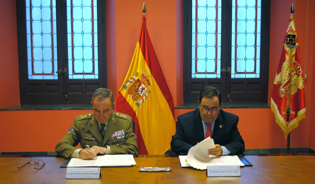 El rector de la Universidad Pablo de Olavide (UPO), Vicente Guzmán Fluja, y el teniente general jefe de la Fuerza Terrestre del Ejército de Tierra, Juan Gómez de Salazar Mínguez, acompañados por la vicerrectora de Relaciones Institucionales de la Universidad, Pilar Rodríguez Reina, han firmado este miércoles un convenio de cooperación educativa entre el Ministerio de Defensa y la Universidad, cuya vigencia será de cuatro años, para que estudiantes de la UPO puedan realizar prácticas académicas externas en unidades, centros y organismos del Ejército de Tierra al objeto de mejorar su cualificación profesional.
