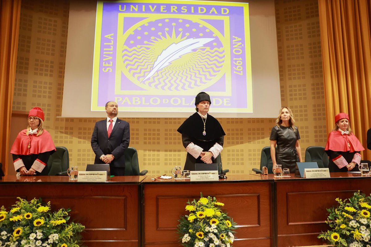 Al acto también han asistido el secretario general de Universidades de la Junta de Andalucía, Ramón Herrera de las Heras; la presidenta del Consejo Social de la UPO, Rocío Reinoso Cuevas; que han participado en la mesa de autoridades junto con la vicerrectora de Relaciones Institucionales y Fundaciones, Laura López de la Cruz, y la secretaria general de la UPO, María Holgado González.
