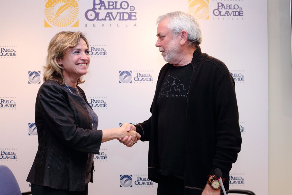 La vicerrectora de Cultura y Compromiso Social de la Universidad Pablo de Olavide (UPO), Elodia Hernández, y el presidente de Solidaridad Internacional Andalucía, Manuel Martínez, han firmado esta mañana un acuerdo de colaboración para la puesta en marcha, en el marco del Aula Abierta de Mayores de la Universidad, del proyecto de formación 'Experiencia solidaria: las personas mayores como motor de la resiliencia en Andalucía'.