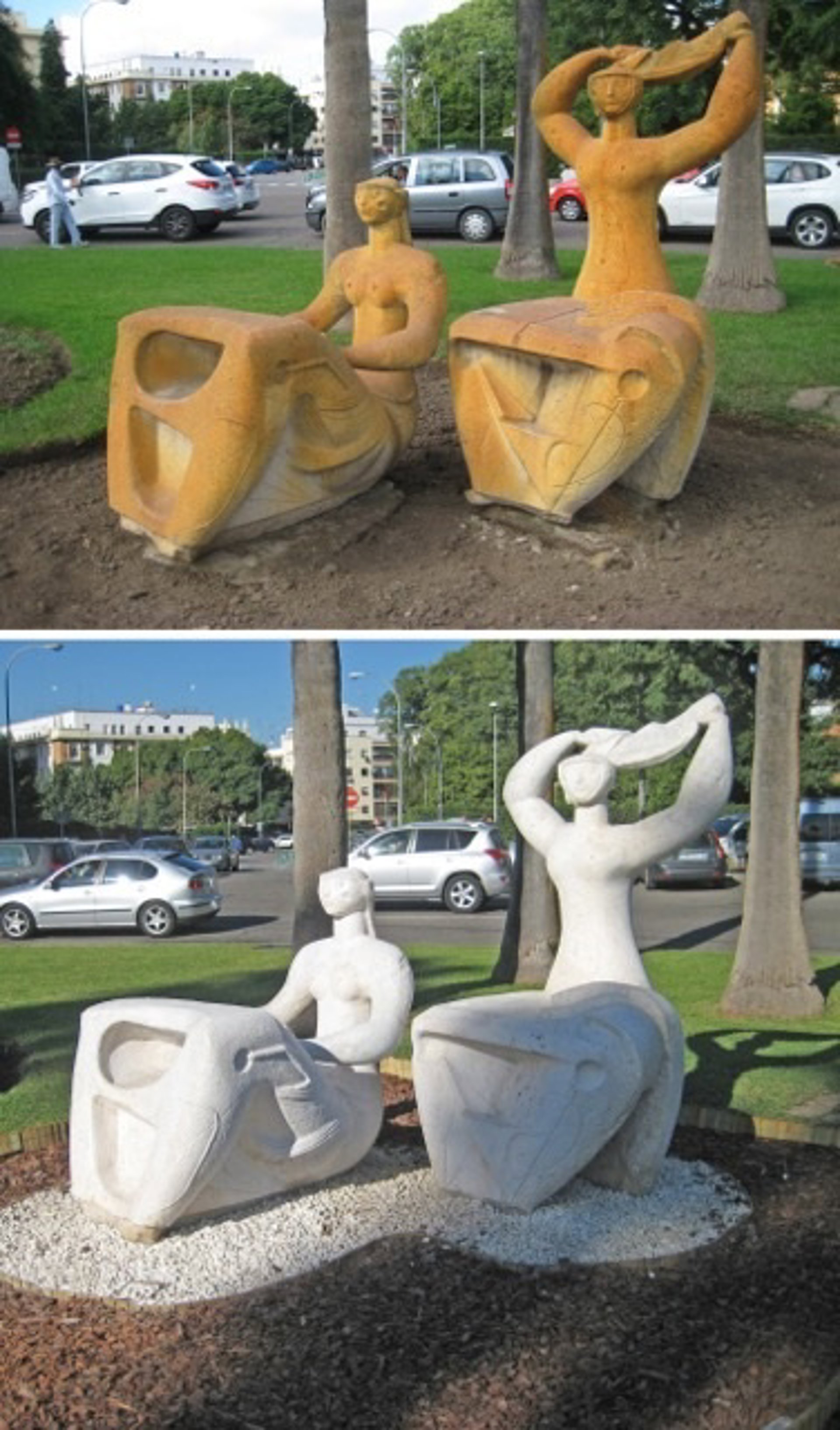 La Gerencia de Urbanismo del Ayuntamiento de Sevilla ha concluido la limpieza de las esculturas conocidas como 'Muchachas al Sol', ubicadas en la Glorieta de las Cigarreras, en el barrio de los Remedios, con un coste total de actuación de 4.932 euros.