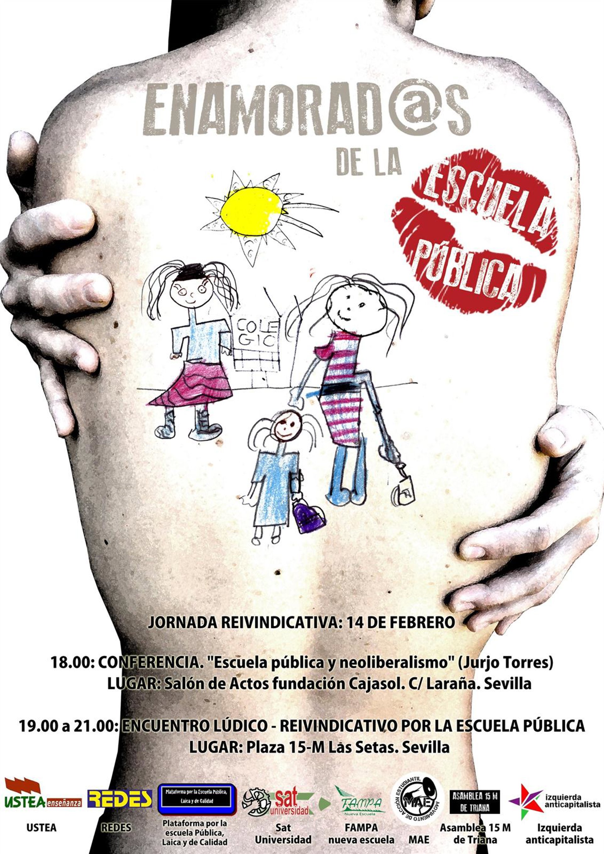 Y en Sevilla, Ustea ha preparado el acto central de 'Enamorados de la Pública'. A las 18,00 horas, el catedrático de la Universidad de la Coruña Jurjo Torres hablará sobre 'Escuela Pública y Neoliberalismo' en el auditorio de Cajasol de la calle Laraña. Después, desde las 19,00 hasta las 21,00 horas, en las Setas de la Encarnación, el sindicato celebrará un acto "lúdico-reivindicativo". Comenzará con la lectura de un manifiesto, al que pondrá la nota musical el artista Kiko Veneno, que actuará a partir de las 19,20 horas. Tras su actuación, se proyectarán vídeos y mensajes de apoyo a la conocida como 'Marea Verde' de los profesores de Comunidad de Madrid, Valencia y Barcelona e intervendrán representantes de la comunidad educativa para explicar por qué se necesita una educación pública.