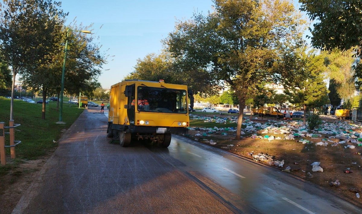 Desde primeras horas de la mañana, operarios de Lipasam se afanan en recoger los restos de basura, ha explicado Antonio Fajardo, que llama la atención también sobre el aparcamiento de decenas de coches en cualquier sitio del barrio, incluido esta vez dentro del propio parque. El presidente de la Asociación Parque Vivo del Guadaíra ha lamentado que "no vimos presencial policial" en la zona de la botellona. Sobre este particular, la Subdelegación del Gobierno desplegó un operativo de seguridad compuesto por más de 800 efectivos.