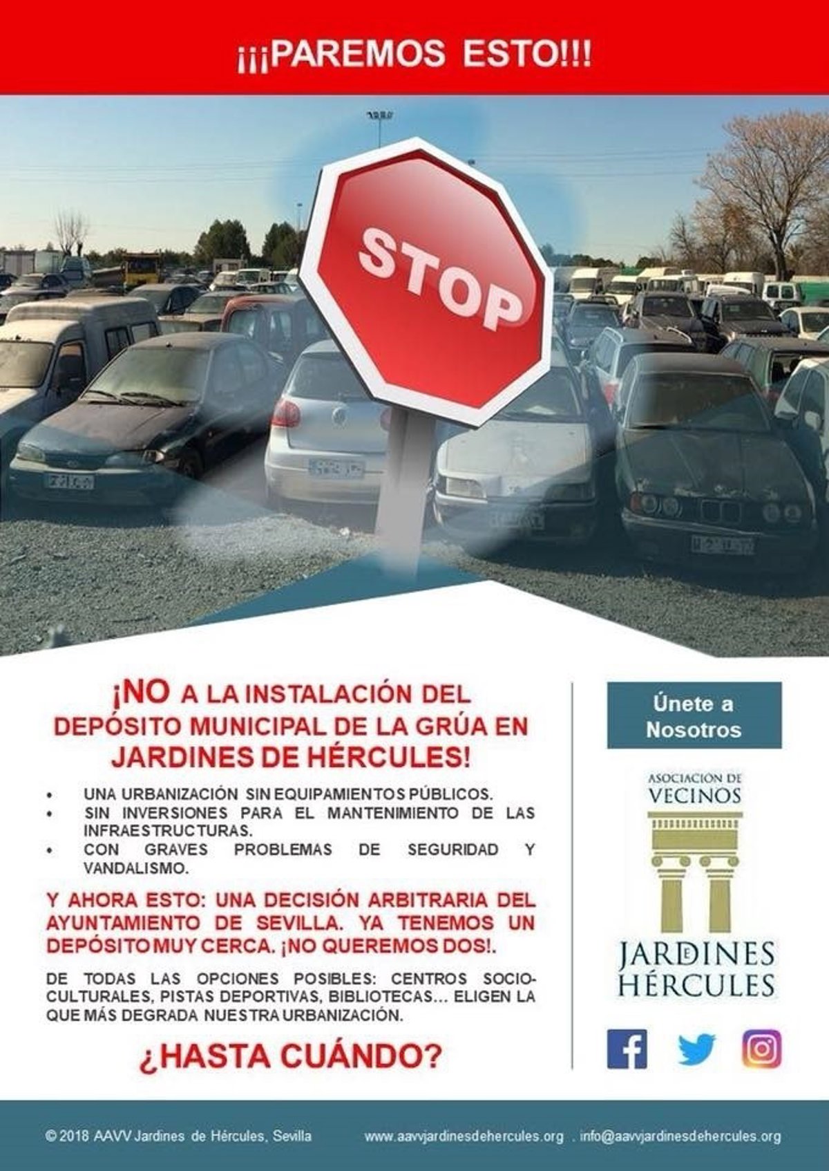 La asociación de vecinos de la urbanización sevillana de Jardines de Hércules, enclavada en el distrito Bellavista-La Palmera, ha celebrado este martes una reunión con una representación del Ayuntamiento hispalense, en torno al proyecto de trasladado a dicha zona de la ciudad del depósito de vehículos del servicio municipal de grúa, que actualmente está instalado en el entorno del parque de Los Príncipes.