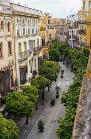 La intervención proyectada en Mateos Gago plantea una ampliación de los acerados reduciendo el que se destina a la calzada y al aparcamiento de vehículos. A lo largo de toda la calle se establece una calzada central de 3,10 metros de anchura, flanqueada a ambos lados por sendas peatonales de dos metros, y a continuación se desarrolla otra banda de 1,40 metros en la que se situarían los árboles y los veladores.