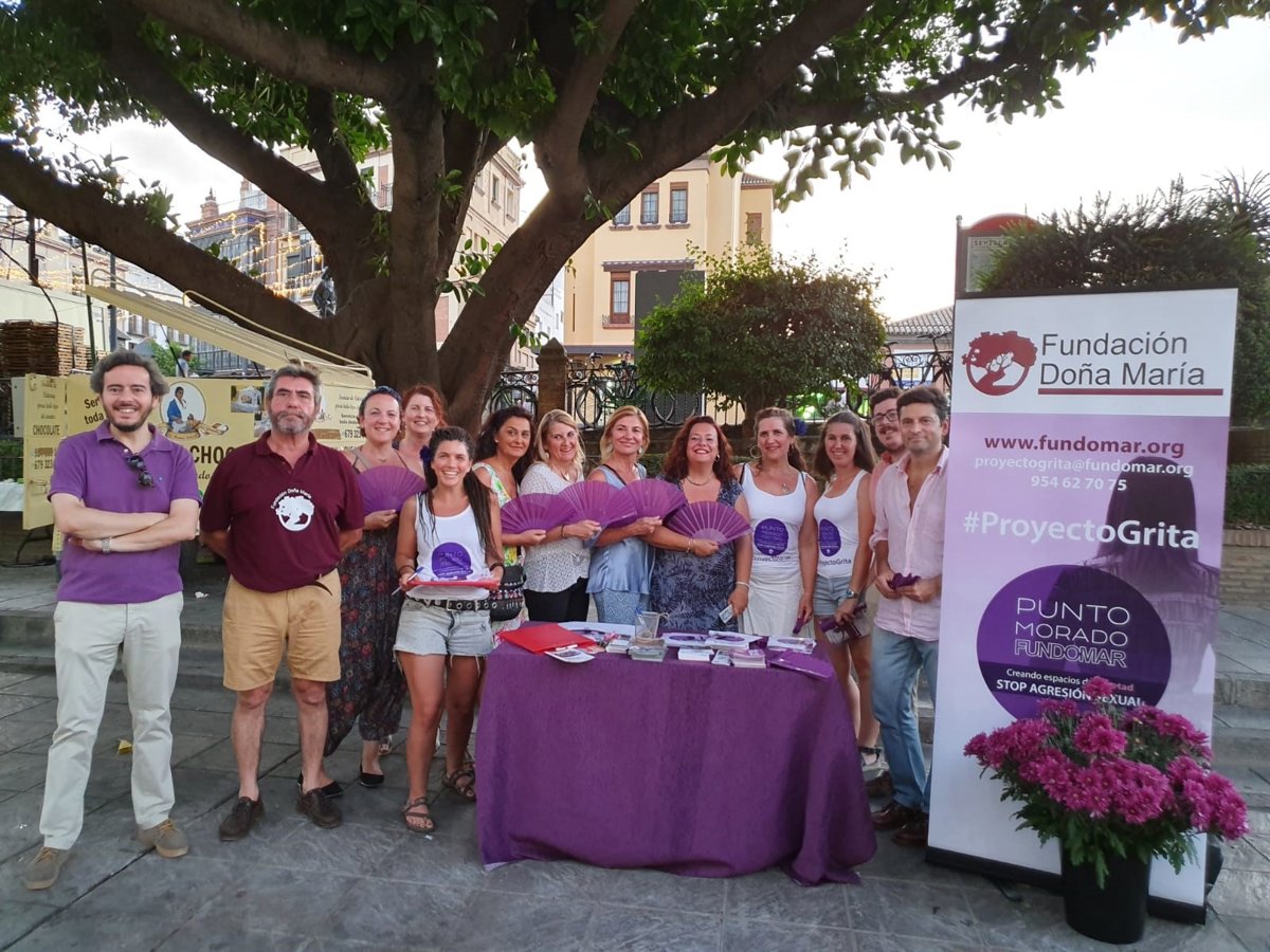 Como novedad este año en la Velá de Santa Ana, el Ayuntamiento de Sevilla, a través de la Delegación de Igualdad, Educación, Participación Ciudadana y Coordinación de Distritos y del Distrito Triana con la colaboración de la Fundación Doña María, ha puesto en marcha el punto morado de información y prevención de las agresiones sexuales.