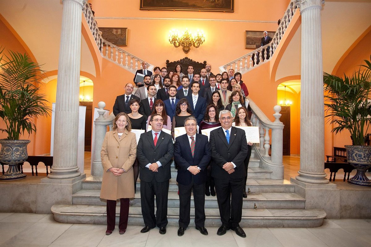 El alcalde de Sevilla, Juan Ignacio Zoido, acompañado por el rector de la Universidad Pablo de Olavide, Vicente Guzmán, y por el rector de la Universidad de Sevilla, Antonio Ramírez de Arellano, ha hecho entrega este jueves de los diplomas e insignias a los 'Mejores expedientes académicos' de las facultades y escuelas de las dos universidades sevillanas.
