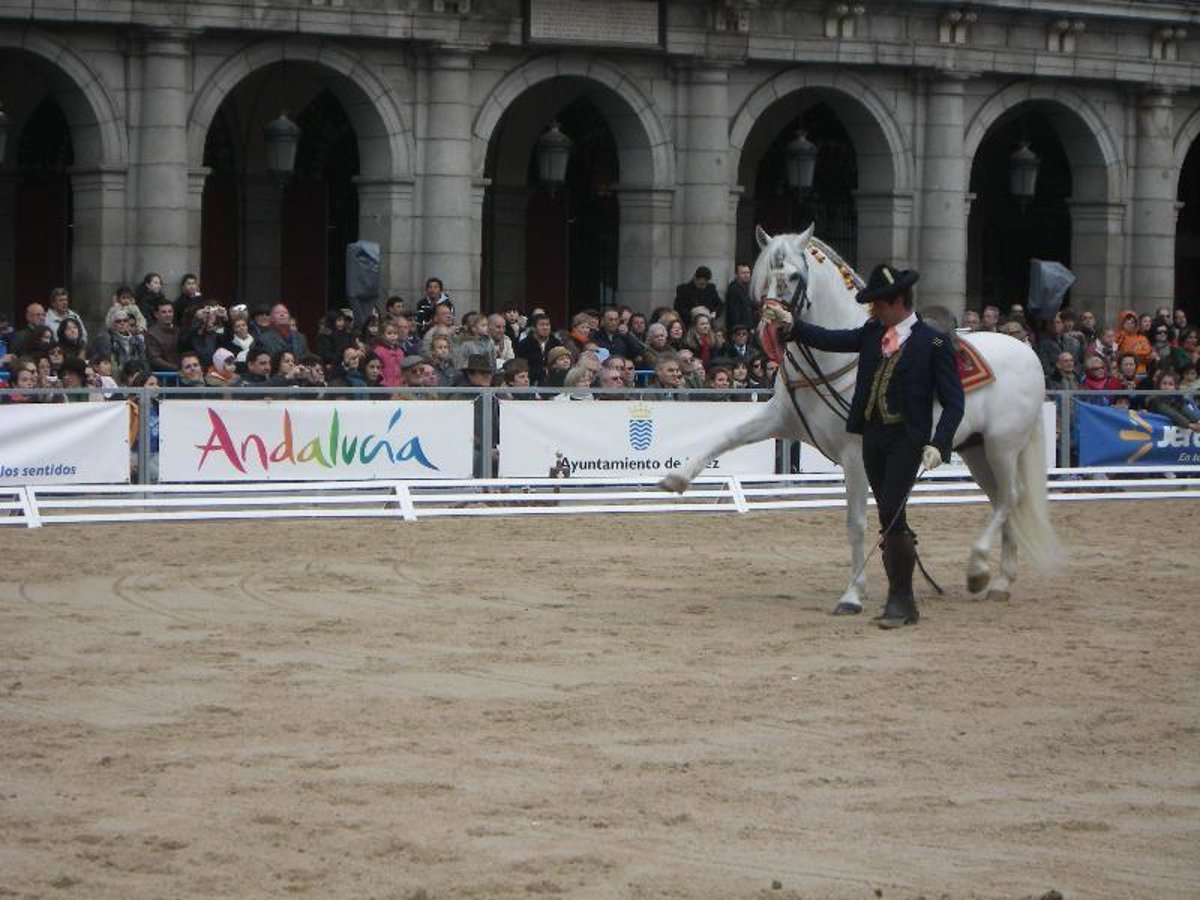 Alrededor de 4.000 personas disfrutaron hoy de una exhibición de la Real Escuela Andaluza de Arte Ecuestre (Reaae) en la Plaza Mayor de Madrid, en una actividad programada con motivo de la Feria Internacional de Turismo (Fitur) que se celebra en la capital de España hasta el próximo domingo.
