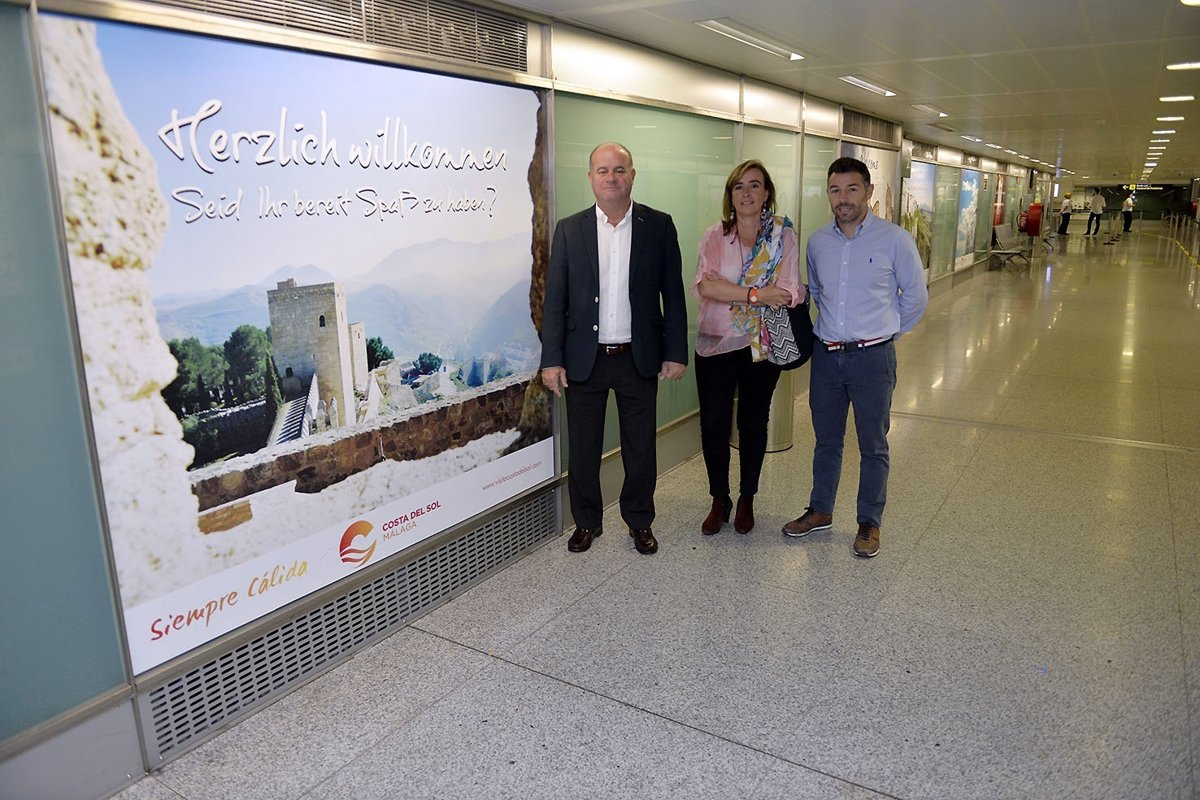 El alcalde de Antequera (Málaga), Manolo Barón, la concejala de Turismo, Belén Jiménez, y el teniente de alcalde de Patrimonio Mundial, Juan Rosas, han visitado el aeropuerto de Málaga donde la ciudad se promociona a través de la campaña promocional de Turismo Costa del Sol denominada 'Siempre cálida'.