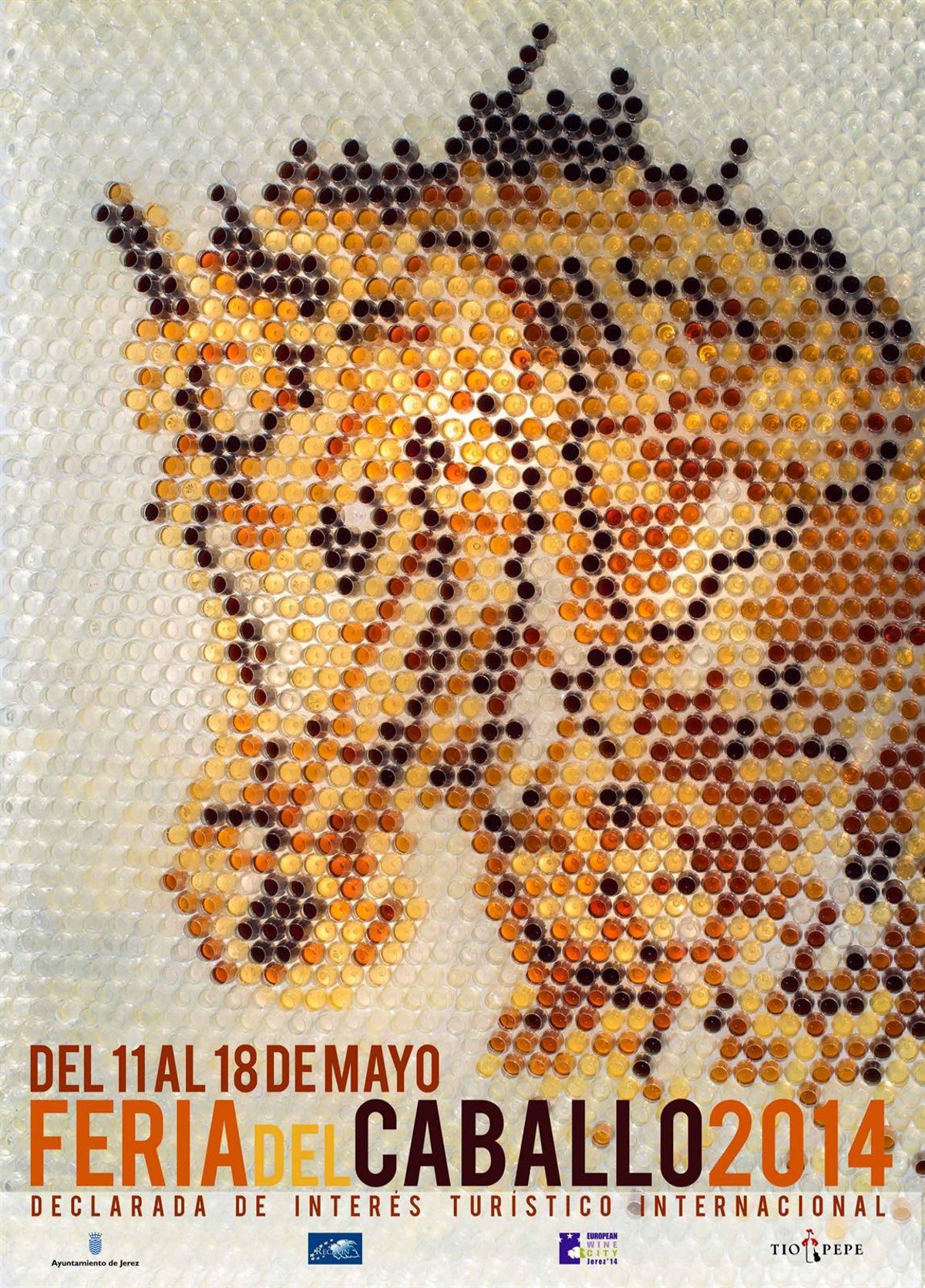El Ayuntamiento de Jerez de la Frontera (Cádiz) ha presentado este lunes el cartel de la Feria del Caballo 2014, dedicada a la Red Europea de Ciudades del Vino (Recevin), que se celebrará del 11 al 18 de mayo. Se trata de una composición de 2.166 catavinos con la cabeza de un caballo como elemento central.