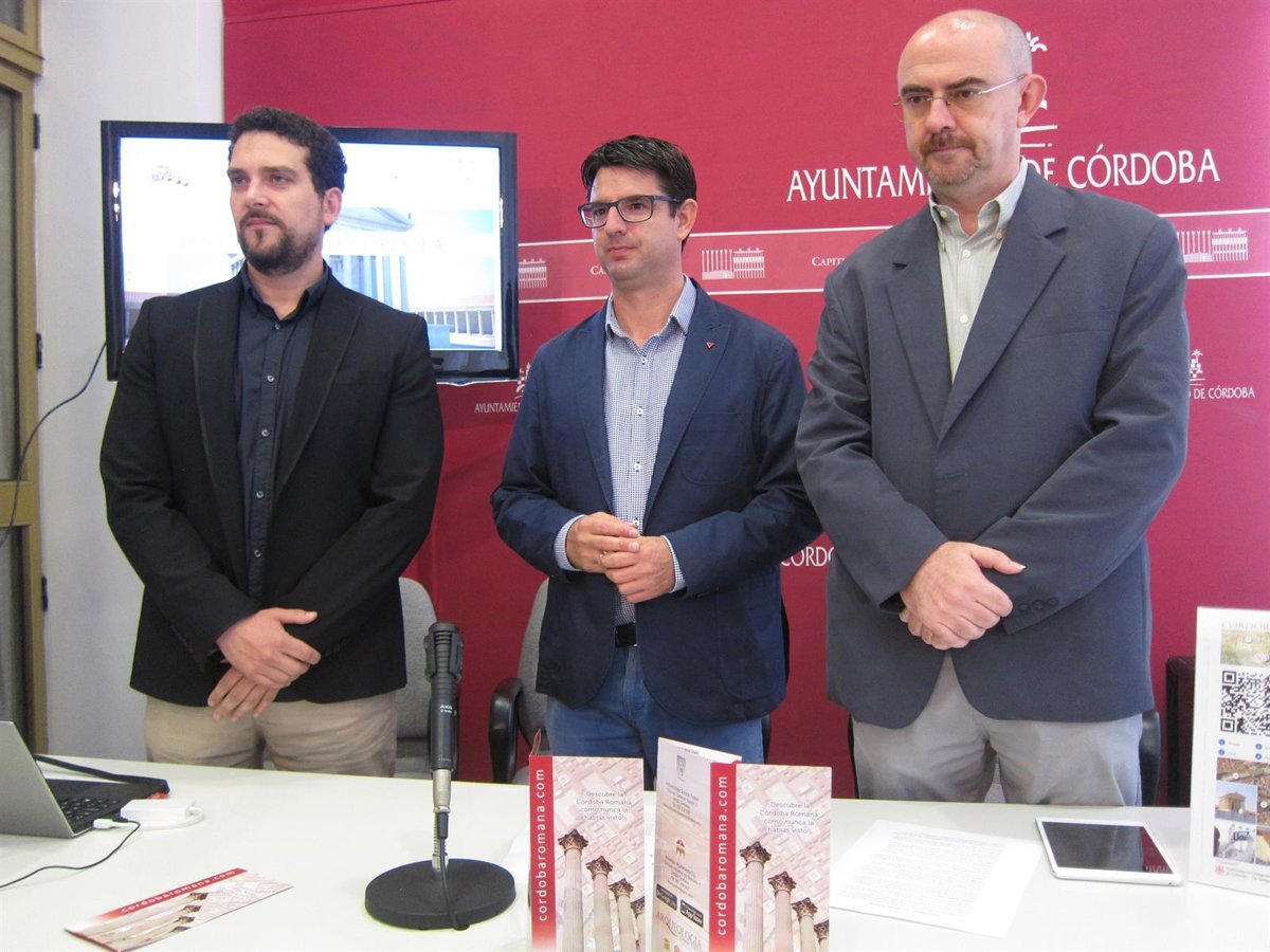 El primer teniente de alcalde y delegado de Turismo del Ayuntamiento de Córdoba, Pedro García (IU), el doctor en Arqueología de la Universidad de Córdoba (UCO) Rafael Blanco y el gerente de Arketipo Multimedia, Juan Carlos Prieto, han presentado este miércoles la plataforma web (www.cordobaromana.com) y la aplicación gratuita 'VirTimePlace', que supone un visor de realidad virtual para recorrer la ciudad en la época romana.