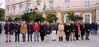 La presidenta de la Diputación, Almudena Martínez, junto a la delegada de la Junta, Mercedes Colombo, y miembros de la Corporación provincial, delegados territoriales y representantes de partidos políticos en el minuto de silencio. - DIPUTACIÓN DE CÁDIZ