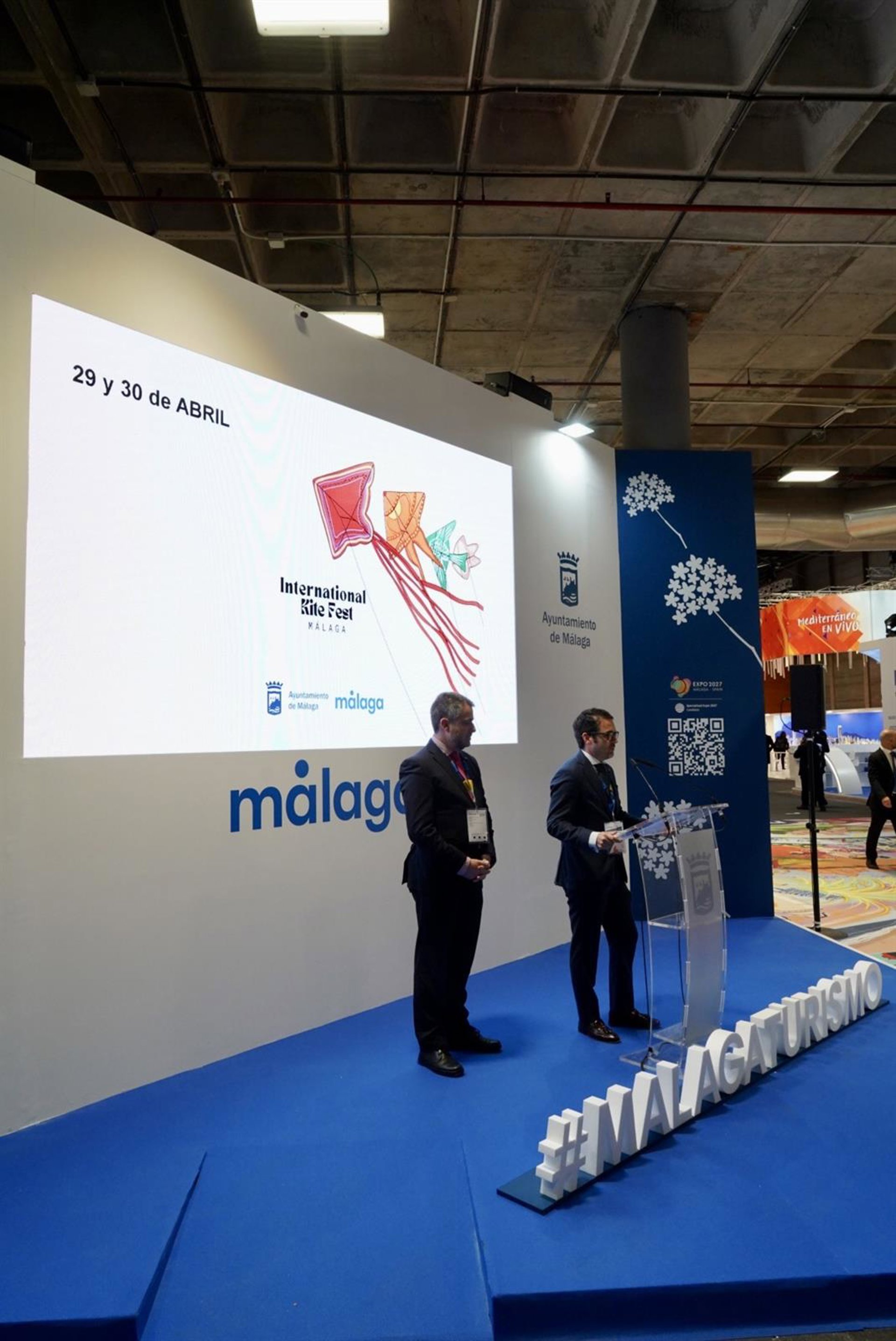 El concejal de Turismo de Málaga, Jacobo Florido, y el concejal del Distrito Málaga Este, Carlos Conde, han presentado este miércoles, en el marco de la Feria Internacional de Turismo de Madrid, Fitur, el International Kite Fest Málaga 2023, un evento de exhibición acrobática de cometas.