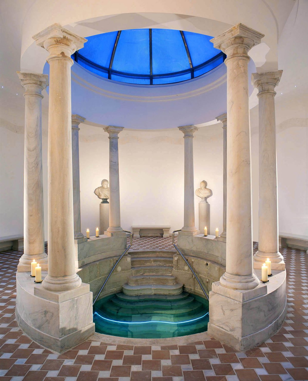 Las termas cuentan con piscinas, cuyos orígenes se remontan al siglo XIX, bañeras con hidromasajes, duchas con masajes subacuático, chorros a presión, cabinas para tratamientos estéticos, diversas modalidades de terapias complementarias y amplias terrazas para la realización de ejercicios de yoga, relajación y meditación.