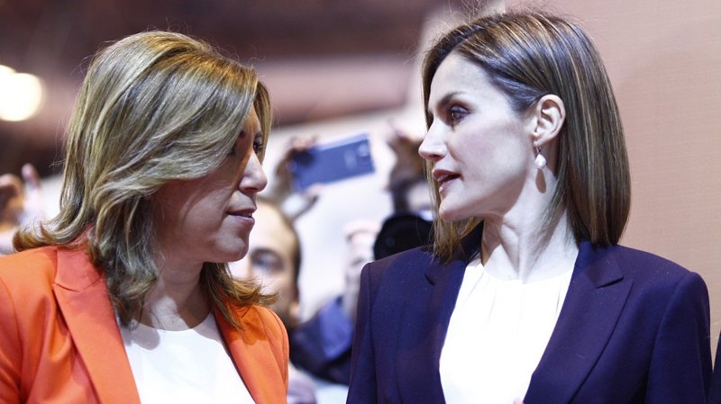 La Reina Doña Letizia ha visitado este miércoles el mostrador de Andalucía en la jornada de inauguración de la Feria Internacional de Turismo que se celebra en Madrid hasta el domingo y ha sido recibida por la presidenta de la Junta de Andalucía, Susana Díaz, quien minutos antes había procedido a inaugurar el espacio andaluz.