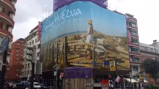 La Diputación de Huelva ha desplegado en Bilbao una lona gigante de 700 metros cuadrados que recubre uno de los edificios del centro de la capital vizcaína, enfrente del estadio San Mamés, recordando a los transeúntes que "la luz de Huelva y sus playas están esperándoles".