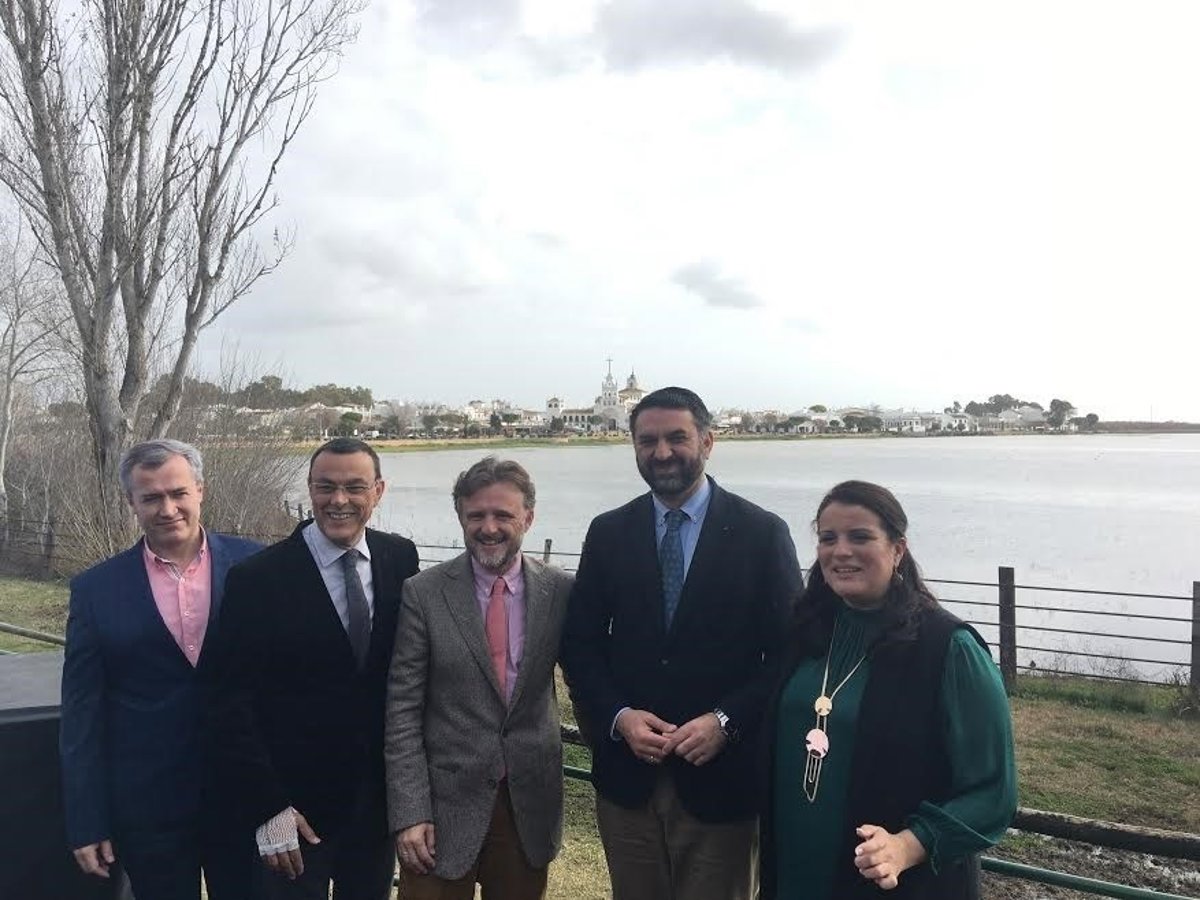 El presidente de la Diputación de Huelva, Ignacio Caraballo; el consejero de Turismo y Deportes de la Junta de Andalucía, Javier Fernández; el consejero de Medio Ambiente y Ordenación del Territorio, José Fiscal; la alcaldesa de Almonte, Rocío Espinosa, y el director general de Institución Ferial de Extremadura (Feval), Manuel Gómez, han presentado este viernes la I Feria de Ecoturismo Doñana Natural Life, que se celebrará en El Rocío desde el 27 al 30 de abril y que persigue potenciar el turismo de naturaleza.