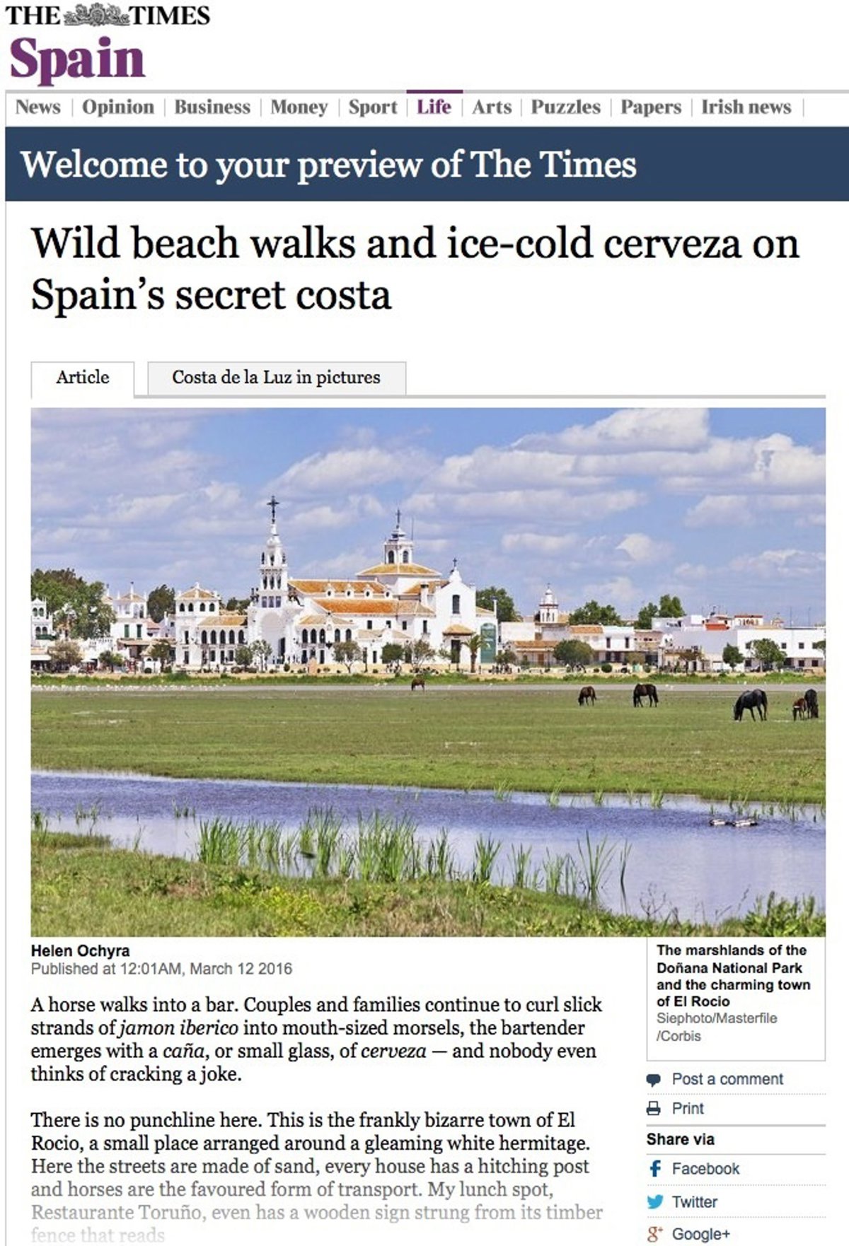 El diario británico 'The Times' vuelve a recomendar la provincia de Huelva como destino y lo denomina 'La costa secreta de España'. Es el segundo artículo sobre viajes en la provincia que publica el prestigioso periódico londinense en menos de un mes.