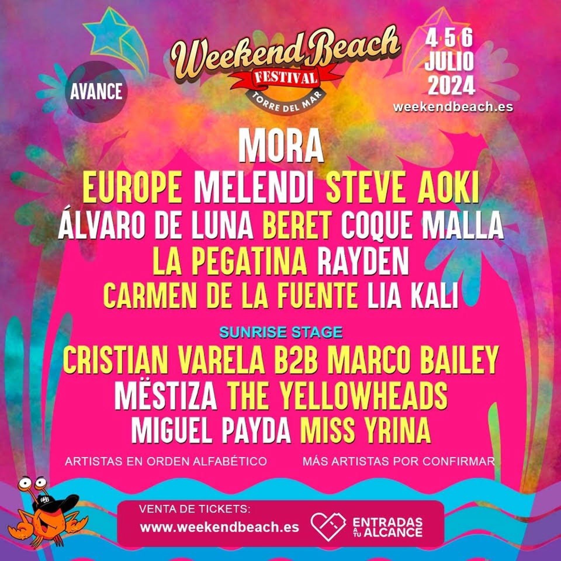 Así Weekend Beach Festival ha adelantado en este acto las actuaciones de Álvaro de Luna, Beret, Coque Malla, La Pegatina y el set de Cristian Varela b2b Marco Bailey. En este nuevo avance también se ha anunciado a Rayden, Mstiza, The Yellowheads, Carmen La Fuente, Miguel Payda, Lia Kali y Miss Yrina que se suman al cartel junto a los ya anunciados Mora, Europe, Steve Aoki y Melendi.