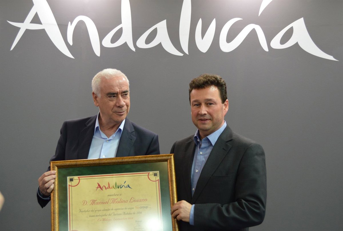 El consejero de Turismo y Comercio, Luciano Alonso, ha entregado este jueves el reconocimiento como embajador de Andalucía 2014 al presidente del grupo de agencias de viajes Touristik Service System (TSS), Manuel Molina, quien ha destacado el aumento del cinco por ciento en las reservas hacia Andalucía en lo que va de año y el margen de crecimiento en este mercado llegando incluso a poder duplicar la cifra que TSS envía a la comunidad en los próximos años.