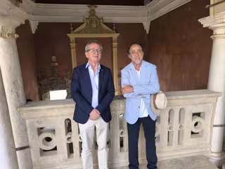 El presidente de la Plaza de Toros de Jaén y de la Federación Taurina jienense, Lope Morales, y el artista, toreador y pintor Luis Francisco Esplá, en la sede Antonio Machado de la UNIA en Baeza (Jaén). - EUROPA PRESS