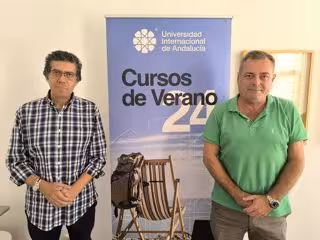 El director del Observatorio Internacional de Oleoturismo, Juan Ignacio Pulido, y el CEO y fundador de Juan Vilar Consultores Estratégicos Juan Vilar en la sede Antonio Machado de la UNIA en Baeza (Jaén). - EUROPA PRESS