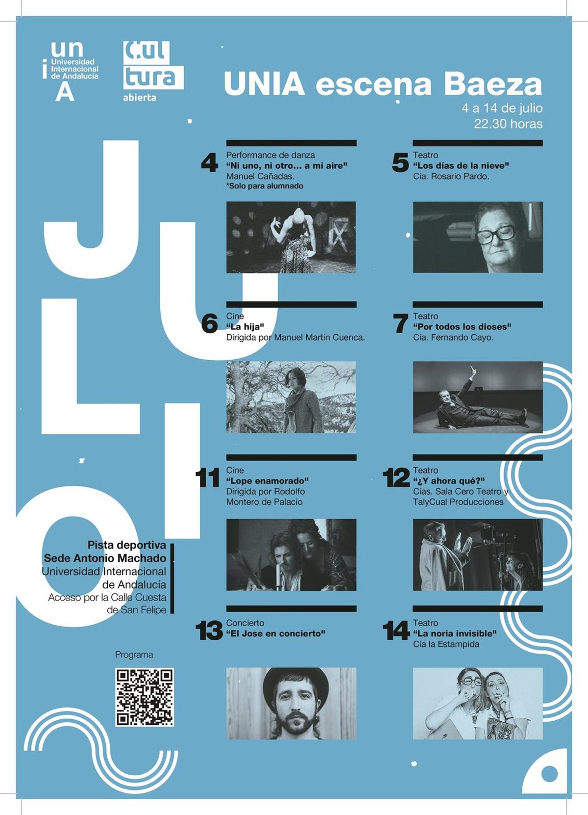La muestra de artes escénicas UNIAescenaBaeza, complementaria a la Escuela de Interpretación de la Universidad Internacional de Andalucía (UNIA), ofrece en la sede Antonio Machado de Baeza (Jaén) teatro, danza, cine y música, del 4 al 14 de julio.
