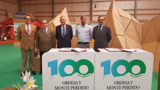 El consejero de Desarrollo Rural y Sostenibilidad del Gobierno de Aragón, Joaquín Olona, y el presidente de Feria de Zaragoza, Manuel Teruel, han firmado el convenio de adhesión como nueva entidad patrocinadora del Centenario del Parque Nacional de Ordesa y Monte Perdido.