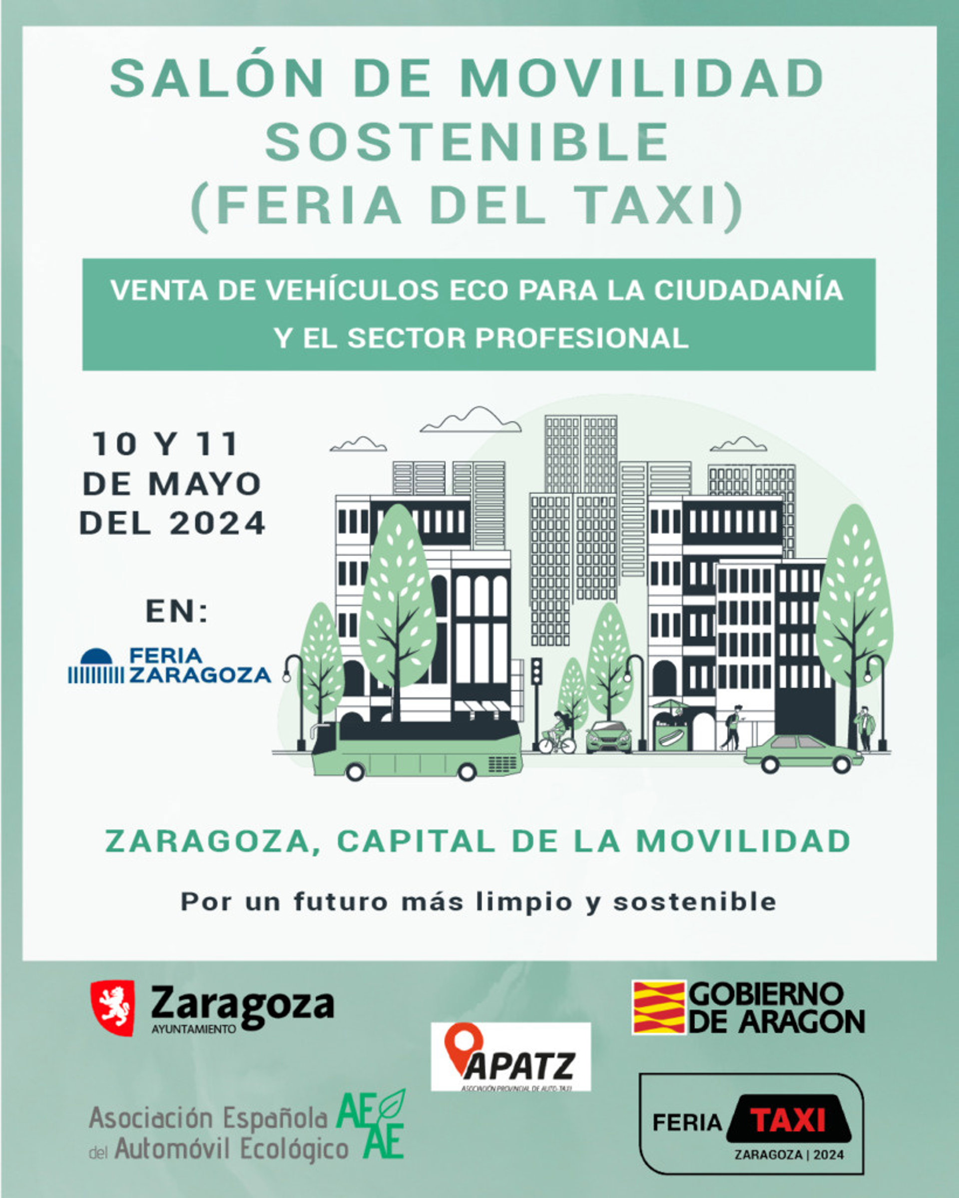 La Feria de Zaragoza acoge los días 10 y 11 de mayo el Salón de Movilidad Sostenible y Feria del Taxi. Este evento está organizado por la Asociación Española del Automóvil Ecológico, con el apoyo del Gobierno de Aragón y del Ayuntamiento de la capital aragonesa, además de la colaboración de la Asociación Provincial de Autotaxi de Zaragoza.