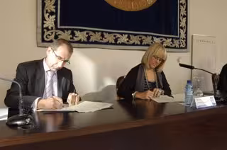 La vicerrectora de Relaciones Institucionales y Comunicación de la Universidad de Zaragoza, Pilar Zaragoza, y el director general de Tecnología de Gamesa, José Antonio Malumbres, han rubricado este miércoles el acuerdo de cooperación, en el Edificio Paraninfo.