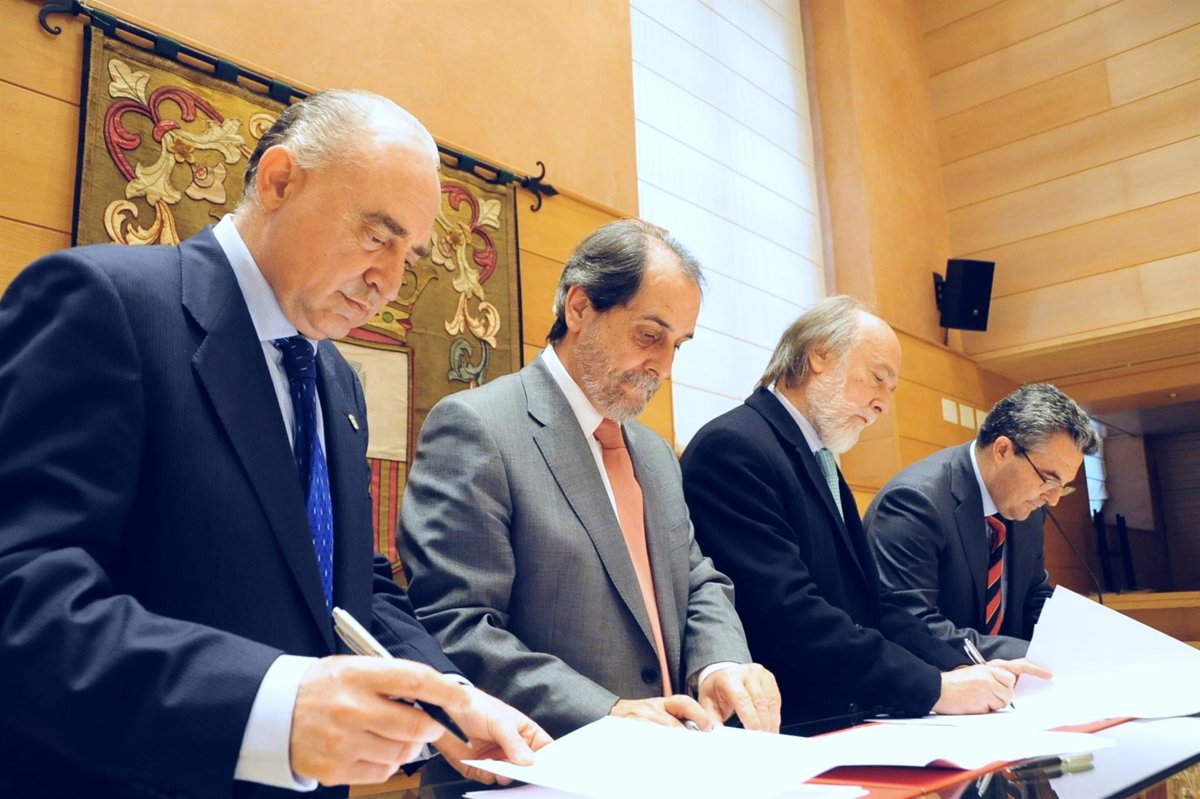 Velasco ha suscrito este martes un convenio con el alcalde de San Mateo de Gállego (Zaragoza), Jesús Villagrasa, y el consejero delegado de LAPEL, Emilio Llano, por el que el Ayuntamiento y LAPEL ceden al Gobierno de Aragón los terrenos de la tercera fase del polígono industrial de San Mateo de Gállego.