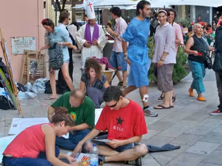 Unos 20 'indignados' han escenificado este jueves, 11 de agosto, en la Plaza de Sas de Zaragoza, cómo funciona la política de gastos del Estado para criticar la financiación de la visita a España del Papa Benedicto XVI con motivo de su participación en la Jornada Mundial de la Juventud (JMJ), que se celebra del 16 al 21 de agosto.