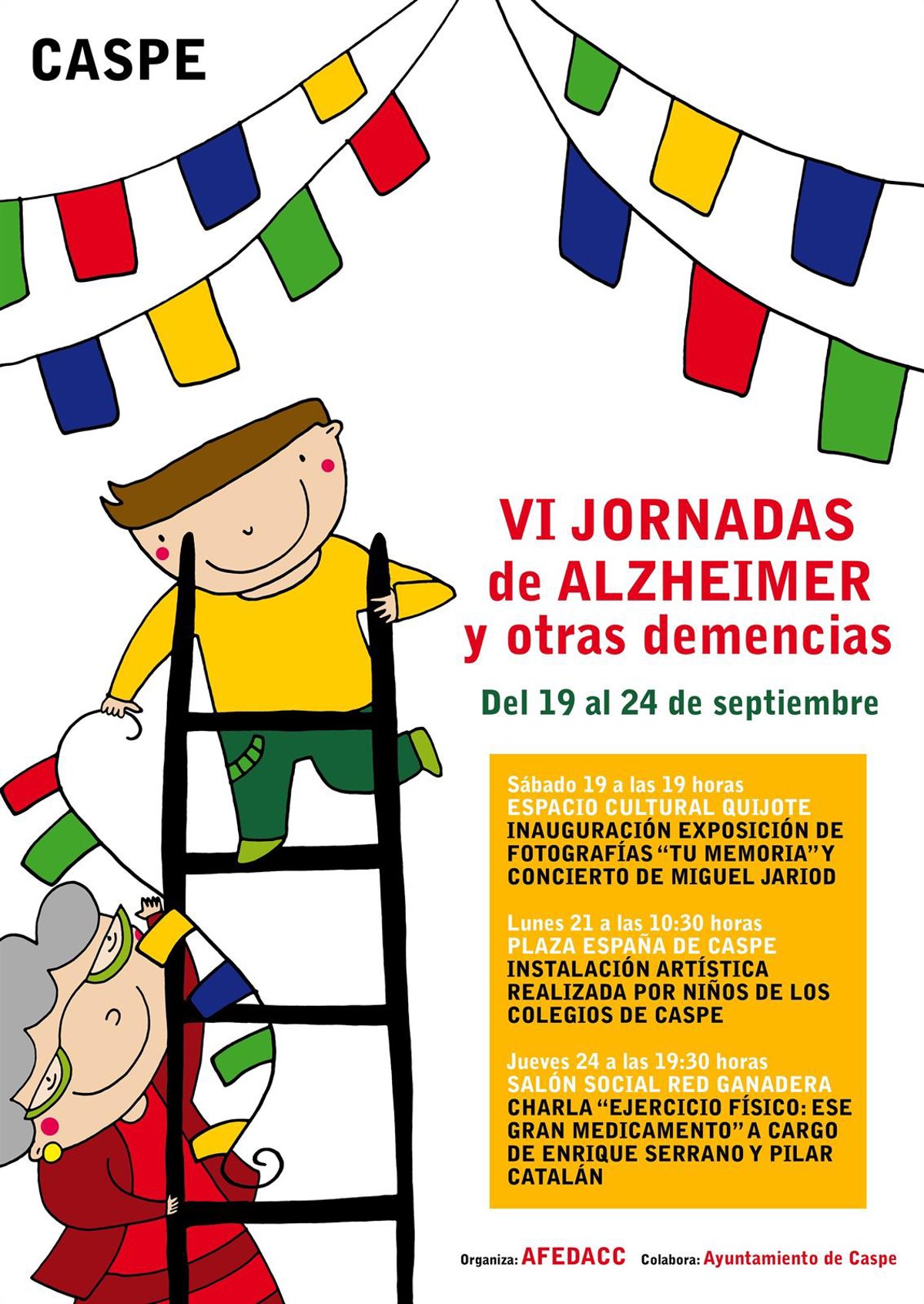 La Agrupación de Familiares de Enfermos De Alzheimer y otras demencias de Caspe y Comarca (AFEDACC) celebra desde este sábado, 19 de septiembre, al día 24 las VI Jornadas de Alzheimer y otras demencias.