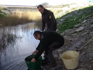 Agentes para la Protección de la Naturaleza (APNs) y técnicos del Departamento de Agricultura, Ganadería y Medio Ambiente del Gobierno de Aragón, con la colaboración de los ayuntamientos de Bujaraloz y La Almonda, han rescatado 950 ejemplares de blenio de río o pez fraile.