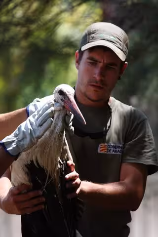 El ave se encontraba enredada con numerosas cuerdas que los propios padres, ajenos al peligro, utilizan para cubrir la cubeta del nido y que constituyen "trampas mortales" para los polluelos. Los APN del Gobierno de Aragón se hicieron cargo de la cigüeña y la trasladaron a La Alfranca.