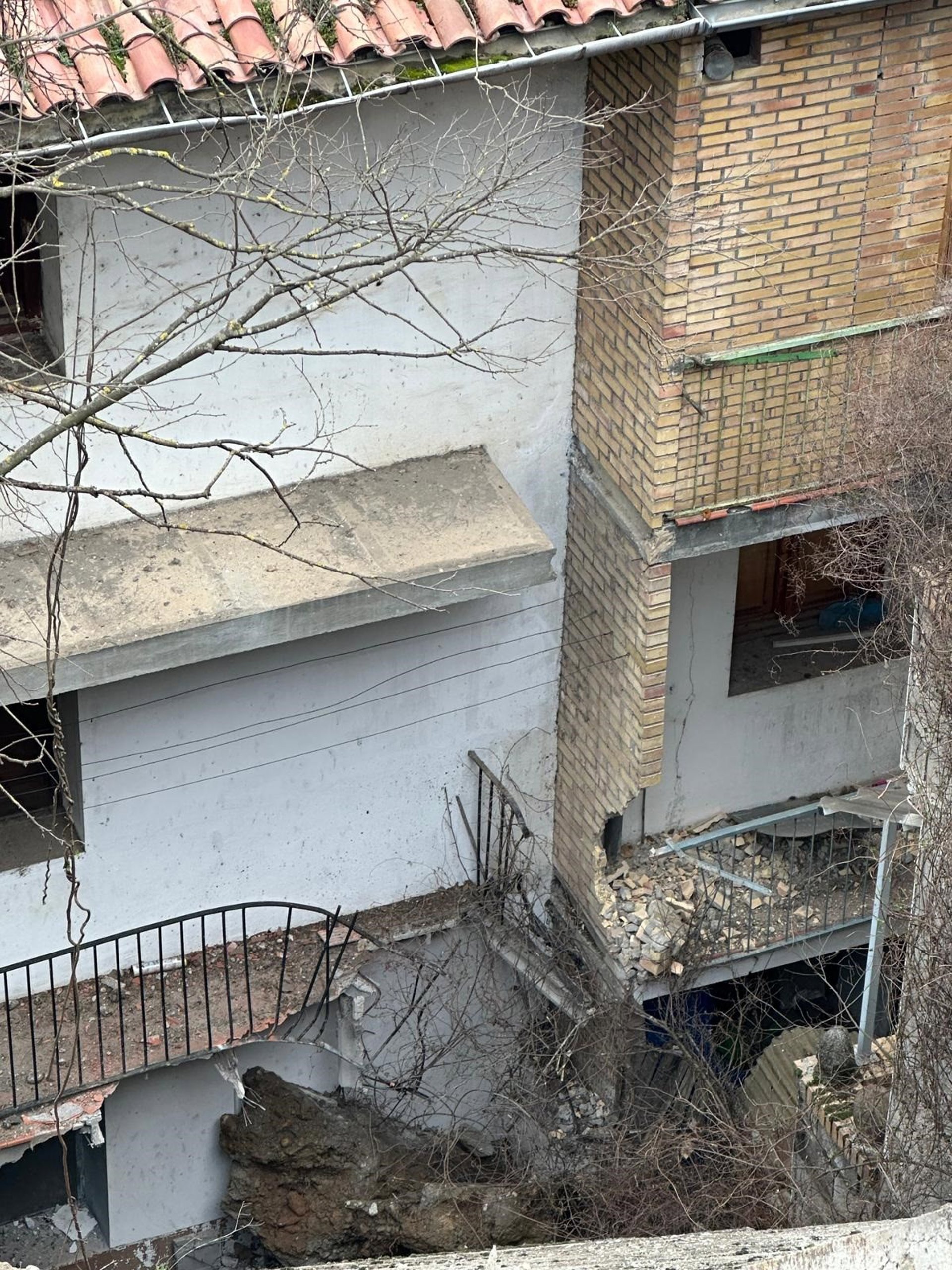 Destrozos ocasionados en varias viviendas tras el derrumbe este sábado de parte de la ladera que sirve de acceso a la villa medieval de Aínsa. - AYUNTAMIENTO DE AÍNSA