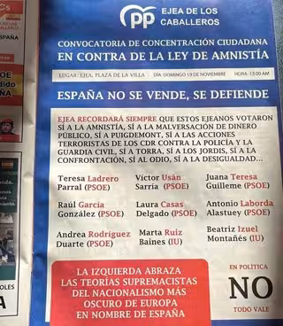 En dicho anuncio nombraron a los siete ediles del PSOE y los dos de IU con sus nombre y apellidos bajo el texto "Ejea recordará siempre que estos ejeanos votaron sí a la amnistía, sí a la malversación de dinero público, sí a Puigdemont, sí a las acciones terroristas de los CDR contra la Policía y la Guardia Civil, sí a Torra, sí a los Jordis, sí a la confrontación, sí al odio, sí a la desigualdad...".