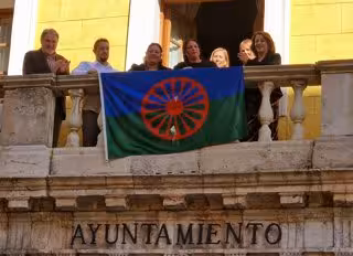 Colocación de la bandera del pueblo gitano en el balcón del Ayuntamiento de Teruel. - AYUNTAMIENTO