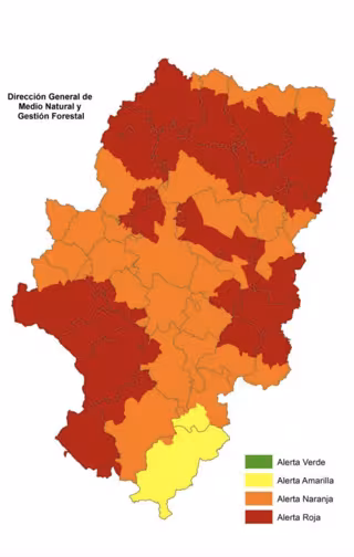 La Dirección General de Interior y Protección Civil ha informado de que la Dirección General de Medio Natural y Gestión Forestal del Gobierno de Aragón ha establecido para este domingo, 15 de agosto, un nivel de alerta roja por peligro de incendios forestales en zonas de las tres provincias de la comunidad autónoma.