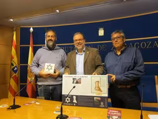 El diputado delegado de Turismo de la Diputación de Zaragoza, Bizén Fuster, el concejal de Turismo de La Almunia, José Manuel Latorre, y el historiador Julián Millán han informado en rueda de prensa de este proyecto, que ha contado con un presupuesto de 7.000 euros.