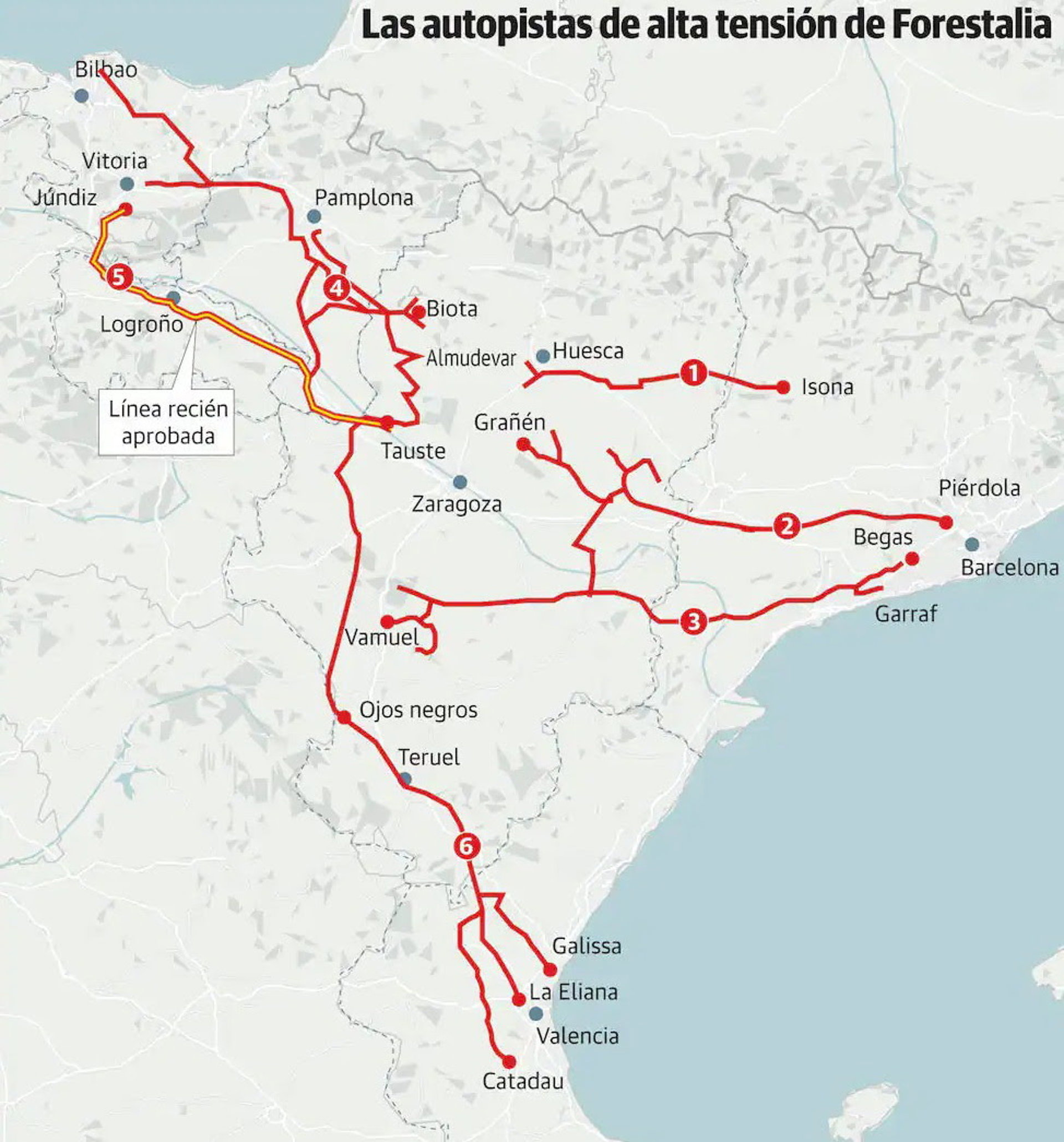 Tras dejar claro que "en absoluto" es para satisfacer las necesidades de electricidad de Aragón porque ya están cubiertas con las instalaciones en funcionamiento, han alertado de que la estrategia es exportarla a las comunidades vecinas por grandes Líneas Aéreas de Alta Tensión --LAAT de 400.000 voltios--.