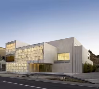 El edificio se presenta como un conjunto de volúmenes rectos, recubiertos de alabastro, un material que se extrae de las canteras a cielo abierto de la zona y que aporta al proyecto un motivo de identificación con el lugar. De hecho el alabastro es de suma importancia en la comarca, convirtiéndose en un referente cultural, además de una fuente de riqueza para sus habitantes.