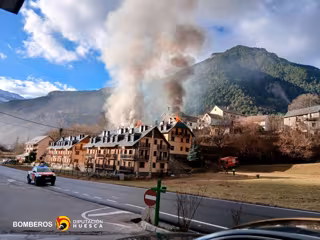 Los Bomberos de la Diputación de Huesca (DPH) trabajan en la extinción del fuego, que se ha originado a las 09.40 horas de este lunes en la cubierta del inmueble y se ha propagado posteriormente a los seis apartamentos situados bajo el tejado y que compartían sistema de aislamiento, ha informado la institución provincial.