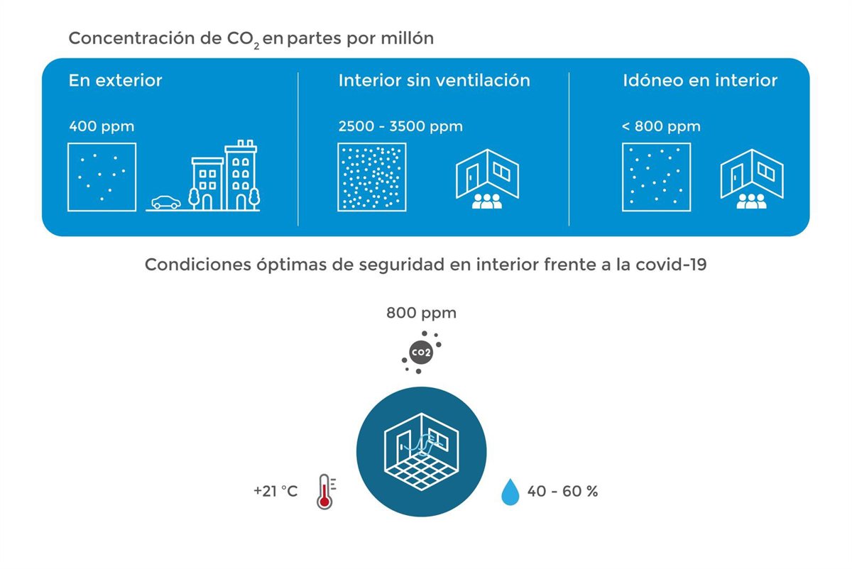 Un aspecto fundamental para determinar la calidad del aire desde casi todos los puntos de vista, pero en especial desde la perspectiva de la dispersión de los aerosoles hasta que su concentración disminuya a tasas no peligrosas, es la concentración o acumulación de CO2 en el ambiente. A una menor concentración de CO2, mejor calidad del aire interior, han sintetizado en una nota de prensa desde el COAATZ.