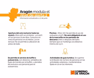 La orden incluye otras modulaciones del nivel de alerta sanitaria 2 en el que se mantiene todo Aragón, como pasar del 50 al 75 por ciento el aforo en las piscinas en exteriores, donde no será necesaria la mascarilla si se está en el césped con personas convivientes; permitir el autoservicio o bufet en la hostelería; y una ocupación del cien por cien de las plazas en el transporte privado.
