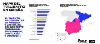 Para establecer el listado se toma una media de los pilares, que oscilan entre 100 puntos como valor máximo para el territorio mejor posicionado y 0 puntos como mínimo. Los resultados muestran que la mayor intensidad de talento se localiza en Madrid, que lidera la clasificación con 71 puntos, y el nordeste peninsular: Navarra --66,7--, País Vasco --63,6--, Cataluña --56,3-- y Aragón --53,9--.